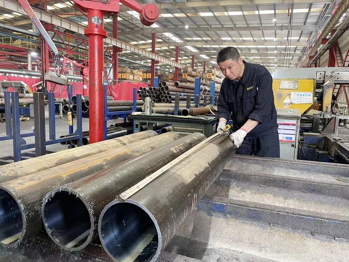 走进位于江苏省扬州市广陵区的海沃机械油缸车间,机械轰隆作响,开足马力生产。吴元海佩戴耳塞和帆布手套,手上的工具在锉刀与修边器之间不停切换,对钢管的内外壁边缘去除毛刺,动作娴熟且老练。