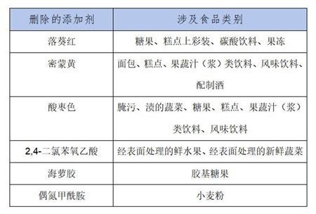 落葵红、密蒙黄、酸枣色、2,4-二氯苯氧乙酸、海萝胶、偶氮甲酰胺在新版的食品添加剂使用标准中被删除,不得在各类食品中使用,具体涉及类别见下表。