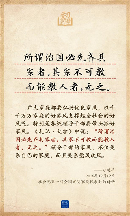 家风是社会风气的重要组成部分。习近平总书记始终重视家庭、家教、家风建设,多次在重要场合引经据典话家风。5月15日是国际家庭日,我们选取总书记相关重要论述,品读其中深意。