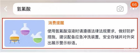 记者在第二家电商平台客户端搜索“氢氟酸”时,其搜索栏下方设置了一栏消费提醒(央广网发来源:电商平台检索页面截图)