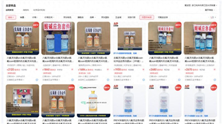 其中,在第一家电商平台搜索时,检索界面弹出的多为包括去氟灵洗眼液、迪辐特灵应急冲洗液等的氢氟酸应急套件;在第二家电商平台搜索时,弹出多个玻璃幕墙清洗剂与氢氟酸含量为9.5%的牙科用氢氟酸酸蚀剂商品;第三家电商平台检索结果则主要为氢氟酸含量为9.5%的牙科用氢氟酸酸蚀剂商品。