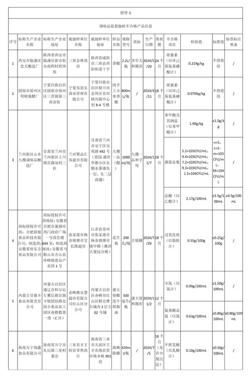 (八)甘肃省兰州聚品汇客超市有限公司销售的、标称甘肃省兰州新区山乡九稷调味品酿造厂生产的九稷一品(醋),其中苯甲酸及其钠盐(以苯甲酸计)检验值、菌落总数不符合食品安全国家标准规定;总酸(以乙酸计)含量既不符合食品安全国家标准规定,也不符合产品标签标示要求。