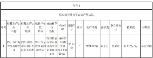 (五)四川省眉山市东坡区菊韵副食店销售的、标称四川省眉山市好好食品有限公司生产的香酥饼(油炸类食品)(紫薯味),其中苋菜红检验值不符合食品安全国家标准规定。