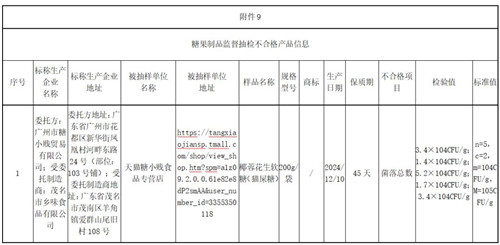 (五)天猫糖小贱食品专营店(经营者为广东省广州市糖小贱贸易有限公司)在天猫商城(网店)销售的、标称广东省广州市糖小贱贸易有限公司委托广东省茂名市乡味食品有限公司生产的椰蓉花生软糖(猫屎糖),其中菌落总数不符合食品安全国家标准规定。