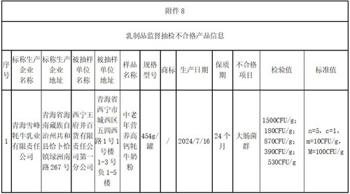(一)青海省西宁王府井百货有限责任公司第一分公司销售的、标称青海雪峰牦牛乳业有限责任公司生产的中老年营养高钙牦牛奶粉,其中大肠菌群数不符合食品安全国家标准规定。