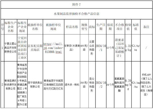 (九)京东杞贡源卖场店(经营者为宁夏昱中贸易有限公司)在京东商城(网店)销售的、标称宁夏云雾山果品开发有限责任公司生产的甘草杏(水果制品),其中甜蜜素(以环己基氨基磺酸计)检验值不符合食品安全国家标准规定。