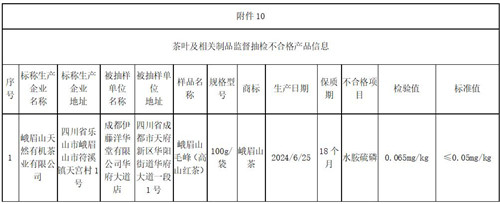 (一)四川省成都伊藤洋华堂有限公司华府大道店销售的、标称四川省乐山市峨眉山天然有机茶业有限公司生产的峨眉山毛峰(高山红茶),其中水胺硫磷残留量不符合食品安全国家标准规定。