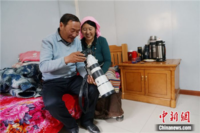 图为肉保夫妇一起看拍摄到的野生动物。中新社记者 李隽/摄