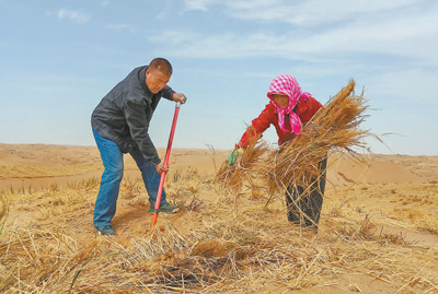 先做压沙草方格。挖开方方正正的草方格,在四边铺上麦草,踩着铁锹,把麦草从间隙里压进去……一次次重复,换来一排排麦草挺立,稳住了片片流沙。