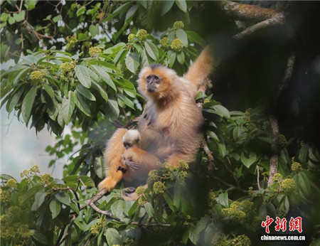 2017年10月,无量山国家级自然保护区,西黑冠长臂猿携幼崽在树上悠闲栖息。唐云摄