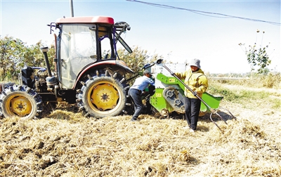 轰鸣的机器声在田野响起,一片金黄色的秸秆被集中收走,农妇挥舞手中的铁叉让田边散落的秸秆离田离沟。