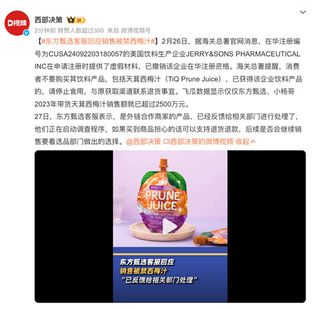 另据西部决策消息,2月27日,东方甄选客服回复表示,该产品系外链合作商家产品,已经反馈给相关部门进行处理了,他们正在启动调查程序,如果买到商品担心的话可以支持退货退款,后续是否会继续销售要看选品部门做出的选择。