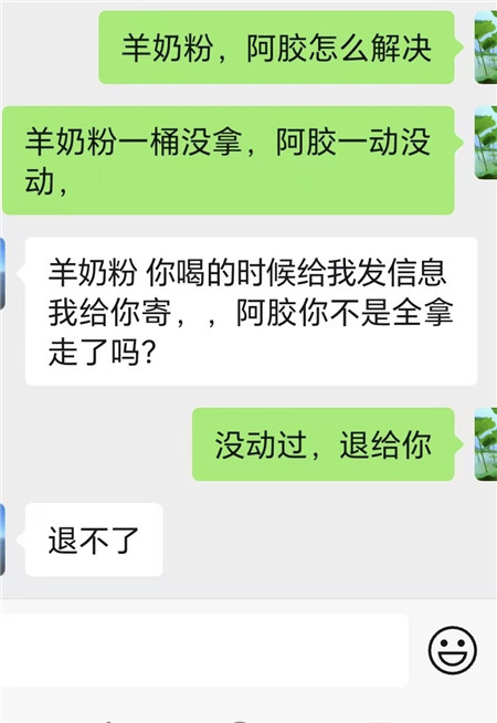 事发至今一个多月,老人越想越后悔。“那些阿胶我不需要,一盒都没拆过。”1月21日,薛女士与业务员发微信,提出要退掉羊奶粉、阿胶,但得到的回复是“退不了”。