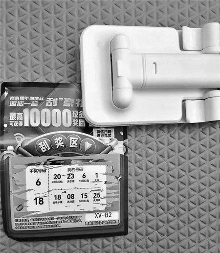 来自四川的李女士告诉《中国消费者报》记者,她前不久收到一个快递包裹,里面有一个手机支架和一张刮刮乐卡片,卡片上写着“商家周年回馈,最高可获得10000元现金奖励”。刮开后出现两个中奖号码,显示获得10元红包和当季水果一份,但想要兑奖需要扫描卡片上的二维码。