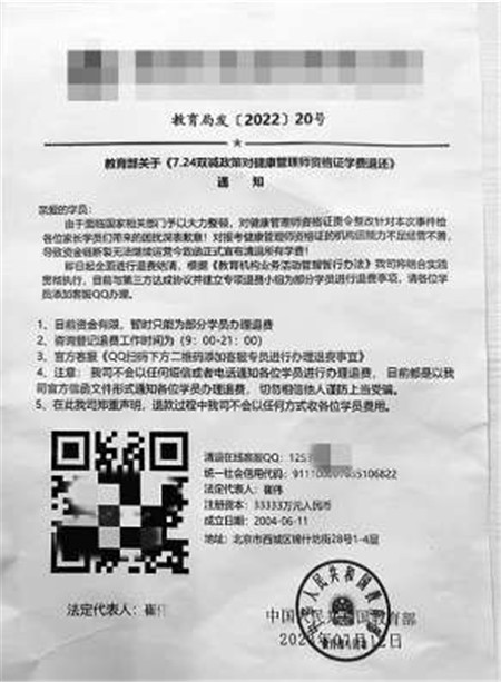 消费者林先生前不久收到了一份文件,抬头是“市场监管总局”、落款是“教育部”,内容则是关于健康管理师资格证学费退还的通知。通知显示,机构经营不善导致资金链断裂,学员可以扫码添加客服QQ号办理退费。林先生确实报考过健康管理师,但从未听说过退还学费的事情。他向机构核实,得知这是骗子的套路。