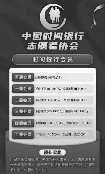 记者了解到,“时间银行”APP将用户分为6个等级,每个级别除了每月固定收入的“时间币”外,还会根据推荐人数一次性奖励500—2000个不等的“时间币”,达到星级会员标准后,可申请晋升该省(区)的志愿者协会会长或负责人。