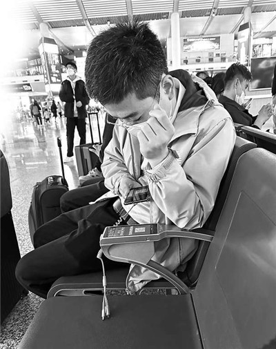 图:高铁站候车的乘客正在扫座椅扶手上的二维码。武晓莉/摄