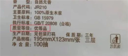 纸巾分为合格品、一等品、优等品,等级越高吸水性和柔韧性越好。记者看了很多编号、原料都正常的纸巾,但等级却是“合格品”,这是纸巾等级中最差的。