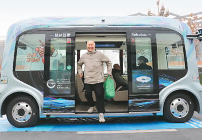 日前,浙江省湖州市德清地信小镇智能驾驶景区公交正式投入使用,给市民带来更智能、更高效、更便捷、更顺畅的出行体验。图为一名乘客从无人驾驶公交车上下车。王树成/摄(人民视觉)