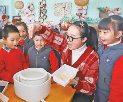 近日,浙江省台州市路桥区中心幼儿园的老师带小朋友认识粮食,培养爱粮节粮的意识。蒋友青、蒋歆慧摄影报道(人民视觉)