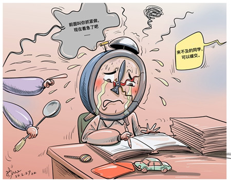 “实在没完成寒假作业怎么办?”杭州师范大学第一附属小学日前发布通知,希望通过“作业缓交期”来缓解孩子开学前的焦虑,减轻家长的负担。(澎湃新闻2月26日)漫画:徐简 中国青年报(2024年02月28日04版)