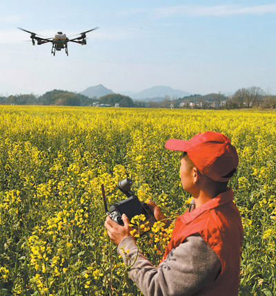 春耕时节,湖北省咸宁市通城县农民与农技人员抢抓农时,利用植保无人机等先进农机和科技手段管理农作物。 图为农技人员在塘湖镇龙印村千亩高产油菜示范基地,操作植保无人机进行飞防作业。 刘建平/摄(人民视觉) 《人民日报》(2024年03月18日第19版)