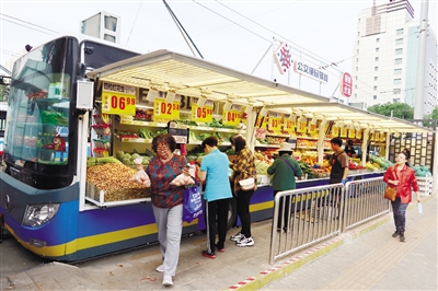 近日,北京市柳芳地铁站口附近的公交场站里,一辆由报废大巴车改装的便民移动服务车正在售卖生鲜蔬果,吸引了大批居民驻足购买。这种“公交便民驿栈”是北京公交集团创立的一种新型便民服务模式。据悉,北京市三年内将建设至少300个便民服务栈点。