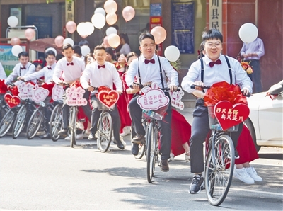 图为新人们骑自行车沿街宣传婚礼新风。肖远泮/摄(影像中国)