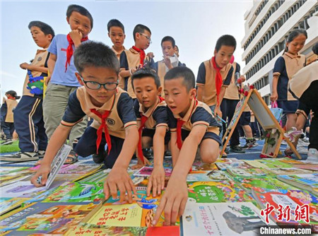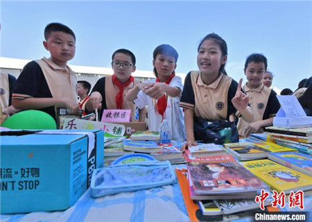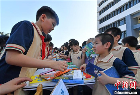 泉港实验小学学生在“跳蚤市场”上挑选书籍。林弘梫/摄