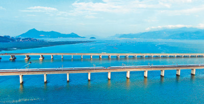 CR300BF型列车驶过温福铁路宁德跨海大桥。胡鹏/摄(人民视觉)
