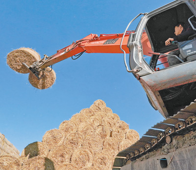 新华社记者杨世尧摄1月7日,河北省唐山市曹妃甸区第八农场稻草回收企业的工人将打好捆的稻草码垛。近年来,曹妃甸区积极探索秸秆利用新途径,将稻草集中收集用于牲畜饲料、稻草制品加工、生物质发电等,有效提高了秸秆综合利用率,促农增收,实现农业绿色循环发展。 《人民日报》(2025年01月08日第02版)