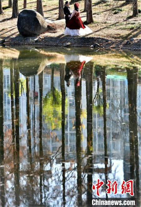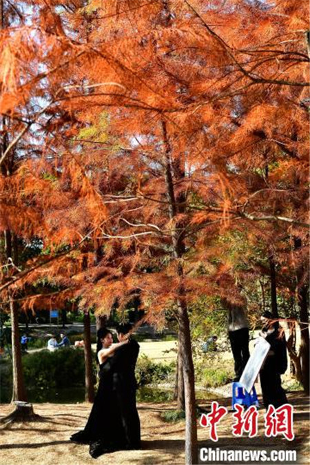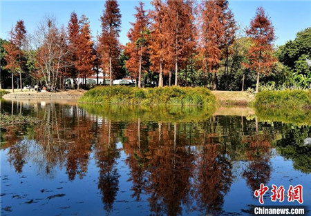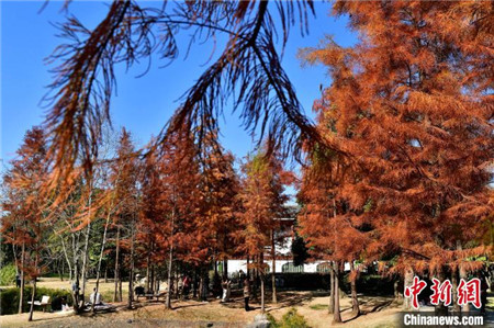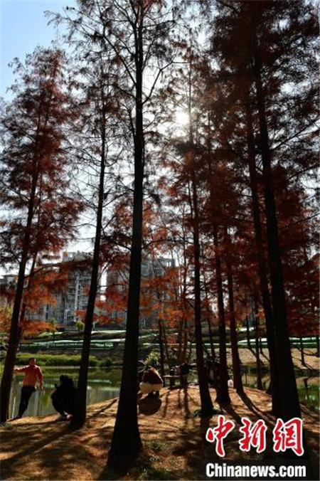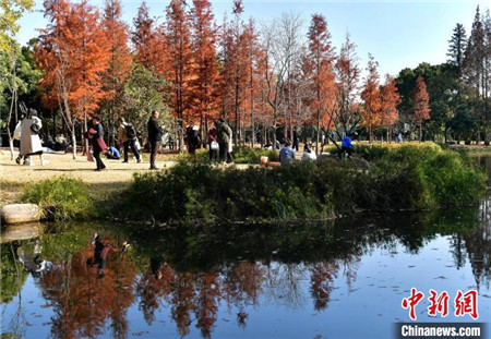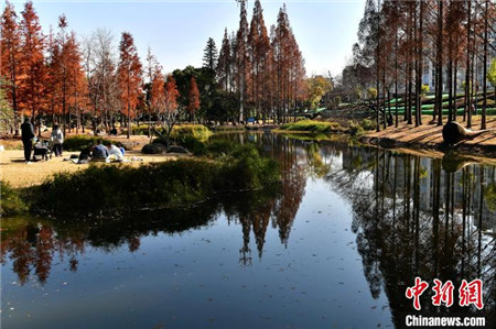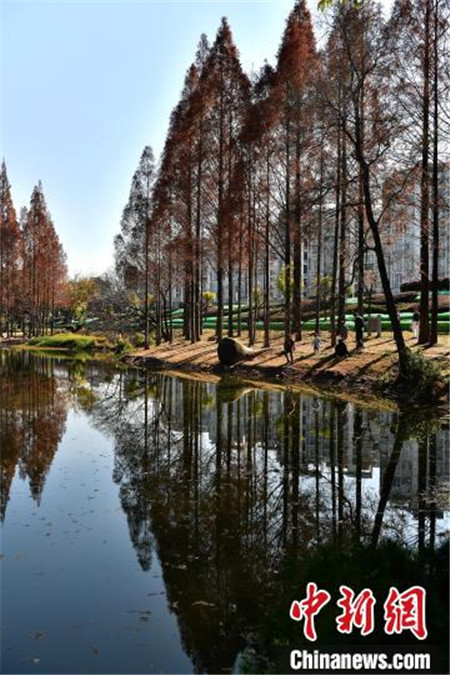 1月12日,福建福州,冬日里闽江公园内种植的水杉与水池相互映衬,景色如画,吸引了许多民众前来游玩拍照。中新社记者 张斌/摄