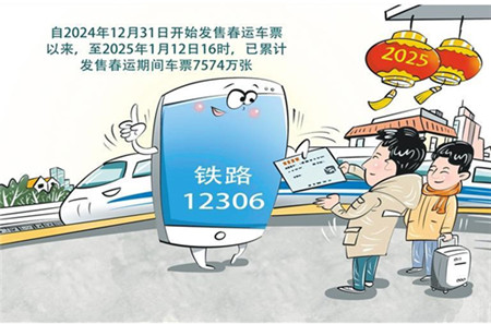 从铁路12306科创中心获悉,自2024年12月31日开始发售春运车票以来,至2025年1月12日16时,已累计发售春运期间车票7574万张。1月11日,12306系统再次经受售票高峰期考验,拒绝经识别认定的异常登录访问请求3982万次,将经识别认定的407万次异常提交订单请求列入慢速队列、对295万单异常候补购票请求延迟处理,系统运行安全平稳。春节高峰期抢票难将持续,平台需时刻注意,加强系统维护和运行,加强车票发售监控和例行巡检,保障用户在春运期间的正常出行购票。各职能部门要加大监管力度,加强协同合作,共同为春运安全、有序、顺畅保驾护航,让广大旅客安心踏上归乡之路,度过一个欢乐祥和的春节。