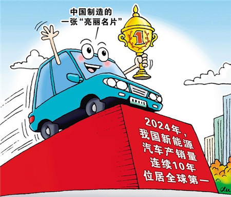 工业和信息化部近日公布数据显示,2024年,我国新能源汽车年产销量迈上千万辆级台阶,分别达到1288.8万辆和1286.6万辆,新能源汽车产销量连续10年位居全球第一。过去10年,我国新能源汽车年产销量从万辆级跨越到千万辆级,产品出口到70多个国家和地区,成为中国制造的一张亮丽名片。也要看到,新能源汽车产业面临国内竞争加剧、国际贸易壁垒高企等新形势新挑战。下一步,应从加强企业技术创新、加大市场推广力度、提升绿色发展水平、着力优化产业生态等多方面施策。加快突破新体系电池等关键核心技术,落实好汽车以旧换新、新能源汽车车购税减免等优惠政策,支持优势企业提质增效做优做强,不断优化产业生态,努力保持新能源汽车产业发展的良好势头。