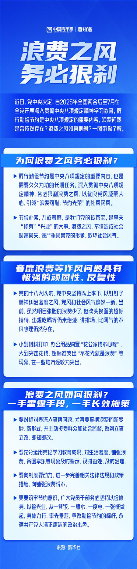 近日,党中央决定,自2025年全国两会后至7月在全党开展深入贯彻中央八项规定精神学习教育。厉行勤俭节约是中央八项规定的重要内容。浪费问题是否依然存在?浪费之风如何狠刹?一图带你了解。