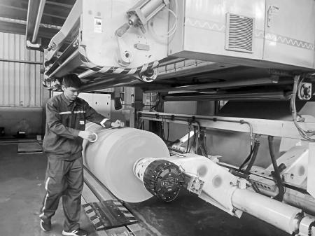 5月14日,该公司操作工李彬彬正将经过绿色低碳技术处理过的纸筒放入原纸架,再将纸筒引入接纸机中。甘皙/摄
