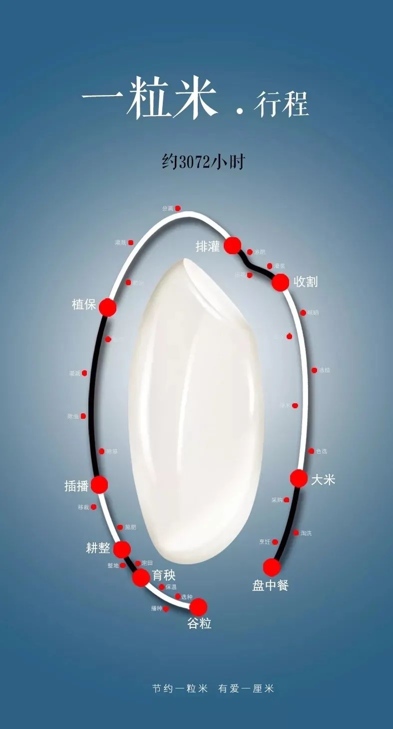 全天候最快全程约3072小时才能到达我们的餐桌,饱满而脆弱,值得我们尊重。珍惜每一粒米的来之不易。