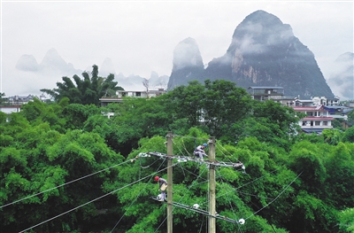 6月27日,在广西壮族自治区桂林市阳朔县兴坪镇大河背村,工人正在拆除横跨漓江的一组共3根电线。为做好漓江核心流域电力设施景观融合,推进电网与绿水青山协调发展,全面支持桂林世界级旅游城市建设,南方电网桂林供电局制定了漓江核心流域跨江线路整改工作专项方案,计划投资3.58亿元建设24个电网基建项目,实施跨江线路整改。人民图片网供图