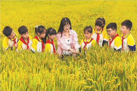 当日是世界粮食日,泰州市海陵区九龙实验学校通过组织学生走进水稻田,近距离观察水稻、体验秋收场景、学习粮食知识等多种多样的活动,培养孩子们爱惜和节约粮食的意识。