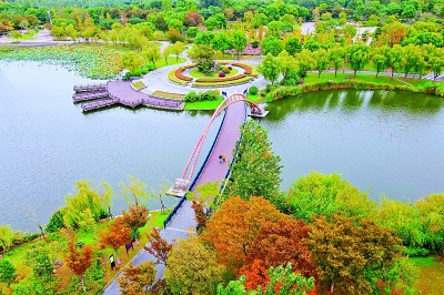 金秋时节,江苏省如皋市龙游河生态公园层林尽染、色彩斑斓,美丽的秋景吸引市民和游客前来赏景游玩,乐享生态之美。图为10月19日,游客在龙游河生态公园游玩。 吴树建摄/光明图片 《光明日报》(2025年10月22日08版)