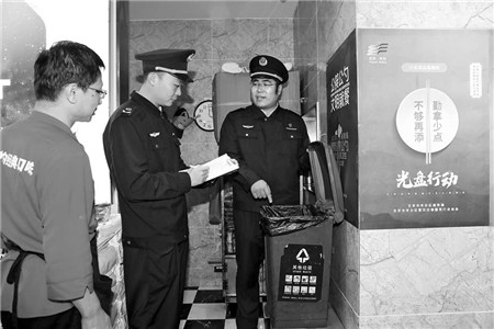 近日,北京市丰台区市场监管局对餐饮场所开展“随机查餐厅”反食品浪费专项检查。执法人员对餐饮服务单位店内反食品浪费宣传、经营者资质、进货查验记录、食品原料管理、后厨环境卫生、加工操作流程等日常管理和制度落实情况进行了全面监督检查,现场指导餐饮服务单位在醒目位置张贴或者摆放反食品浪费标识,主动引导消费者适量点餐,主动提供打包服务。本报记者董芳忠摄影报道