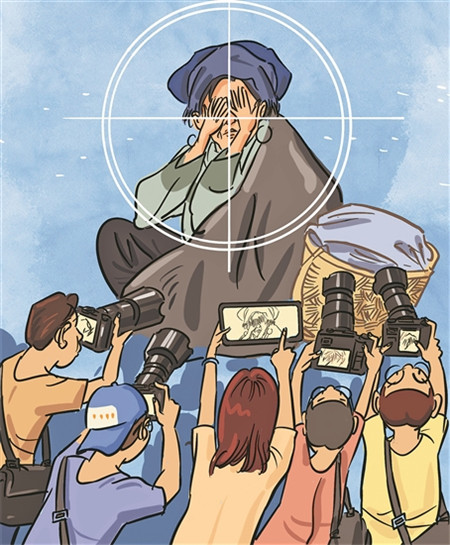 游客一路走一路拍摄,从记录文化差异、感知人文地理风貌的角度看,拍摄特定着装的人物及其生活,通常并不算越界,前提是对方知情同意或者不拒绝。然而,很多时候,一些人在拍摄风土人情时似乎有“绑架”嫌疑,不顾对方意愿,“长枪短炮”直接上。从怼脸拍人物,到擅闯老建筑拍摄居民院子,再到“吃播”以其他顾客当“背景板”拍视频,此类以“记录”为名的越界行为涉嫌侵犯他人隐私权和安宁权。感知地域文化,快门怎么按、何时按,体现着拍摄者的态度和格局,以令人不适的方式获得的画面,并不美丽。