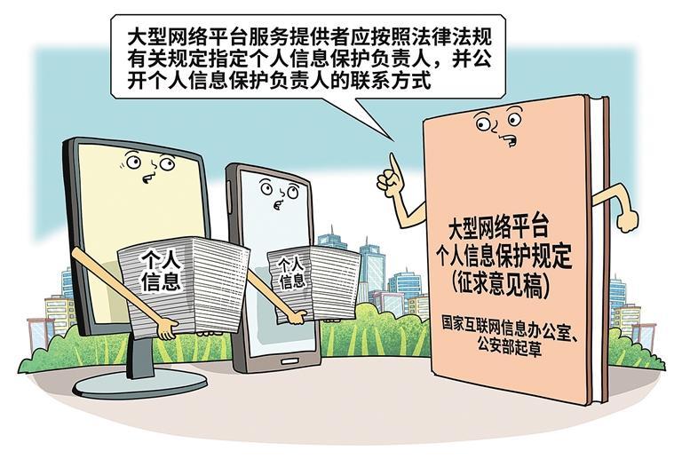 为规范大型网络平台个人信息处理活动,保护个人信息合法权益,促进平台经济健康发展,国家互联网信息办公室、公安部起草了《大型网络平台个人信息保护规定(征求意见稿)》,于近日向社会公开征求意见。根据征求意见稿,大型网络平台服务提供者应按照法律法规有关规定指定个人信息保护负责人,并公开个人信息保护负责人的联系方式。为确保新规落地见效,还需各方协同推进。相关部门应根据反馈情况完善征求意见稿,细化大型平台认定标准与合规要求;平台企业应设立符合条件的个人信息保护负责人,建立健全内部合规体系。此外,广大用户可通过平台提供的专门渠道行使查阅、更正、删除等权利,积极参与社会监督,对违规行为进行投诉举报。