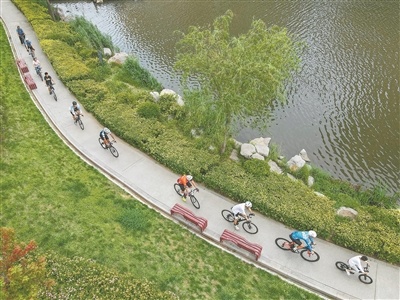 近日,在山东省青岛市李沧区李村河畔,浮山路街道金液泉路社区新时代文明实践站组织市民开展“节能有我·低碳出行”主题宣传活动,倡导健康低碳的绿色出行方式,提升市民节能降碳和保护生态环境的意识。图为市民在李村河畔骑行。