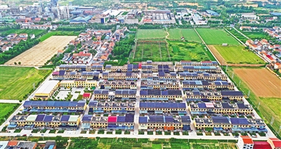 近年来,河南省孟州市坚持生态优先理念,大力发展光伏发电、风力发电等清洁能源和可再生能源,采取“自发自用、余电上网”模式,引导社区绿色发展、居民绿色生活,助力乡村振兴。图为河南省孟州市义井村新型社区,农户屋顶上的光伏板整齐排列。