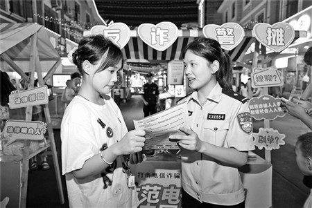 民警“摆摊”话反诈7月31日晚,在江苏省宿迁市宿城区宝龙广场夜市,富康路派出所民警向市民宣传防诈骗知识。自夏夜治安巡查宣防集中统一行动以来,宿城分局富康路派出所积极探索反诈宣传新模式和新举措,带着反诈宣传资料走进辖区夜市摆摊,现场向商家及过往群众宣传反诈防诈知识,接地气的宣传方式受到市民好评。王力摄/人民图片 《工人日报》(2023年08月03日07版)