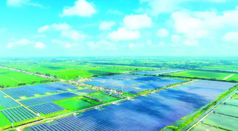 8月1日,洪泽区岔河镇陈向村,一排排整齐的光伏板与周边的绿色田园、错落民居、田间道路相互映衬,美如画卷。近年来,洪泽区坚持生态优先、绿色发展理念,聚焦绿色低碳转型发展,大力建设“农光互补”光伏电站,在光伏板下发展芡实种植产业,采取“企业+农户”的合作模式,将光伏发电和高效农业有机结合,促进企业增效、农民增收,助力乡村振兴。