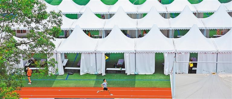 作为一座2008年建成投用的老场馆,成都双流体育中心在改造升级过程中,采用临建的方式,在比赛场外侧的田径训练场布置了79顶白色帐篷,用于运动员的休息、热身。高兴贵/摄