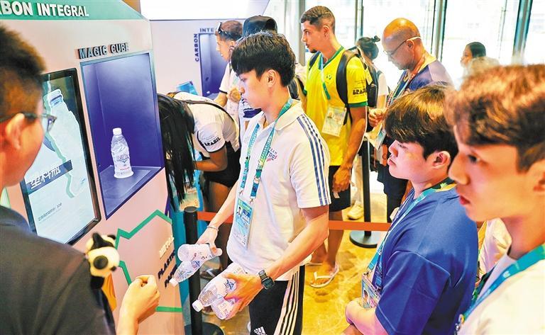 成都大运会大运村内的“低碳魔方”互动装置前,运动员将喝完的矿泉水瓶、易拉罐等废弃物品投入其中,机器即可生成碳积分小票,凭小票可兑换相应的礼品。高兴贵/摄