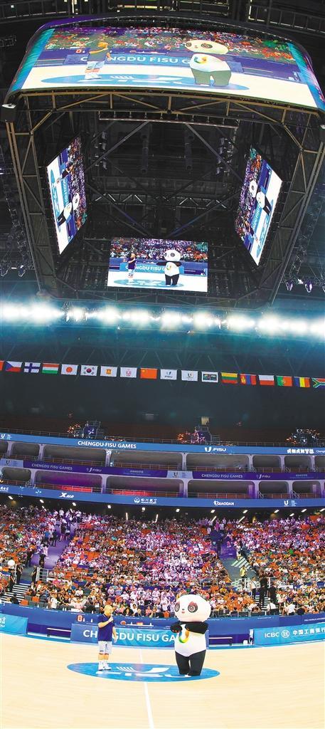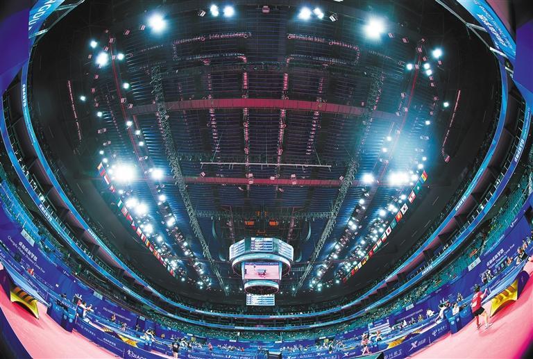 成都高新体育中心多功能馆配有节能灯光灯控、空气对流系统、雨水回用系统、能源管控中心及高科技环保材质座椅,在满足赛事需要的同时也实现了绿色低碳办赛。高兴贵/摄